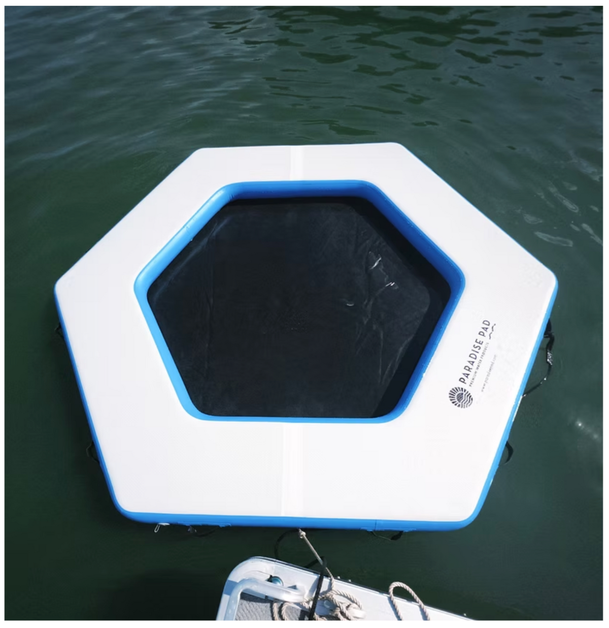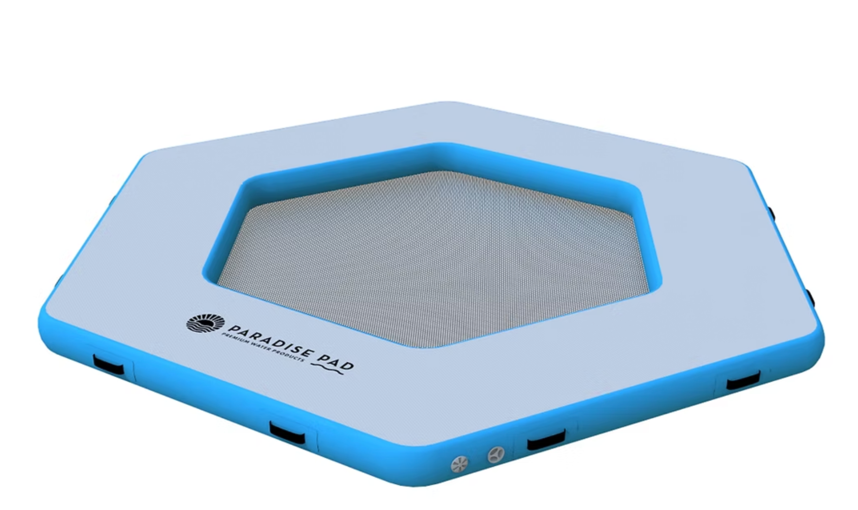 A great new addition to our lineup of mesh products, this inflatable swim pad is perfect for cooling off in the water or lounging comfortably around the perimeter. The durable shoelace-style mesh center, free of metal eyelets, prevents rust and ensures long-lasting use. With an impressive capacity of up to 12 people or 2,750 lbs., it's ideal for large groups and family gatherings.