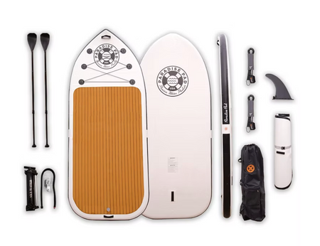 INCLUDES: dual action hand pump, 2 fiberglass 3-piece adjustable paddles, ankle leash, & storage bag