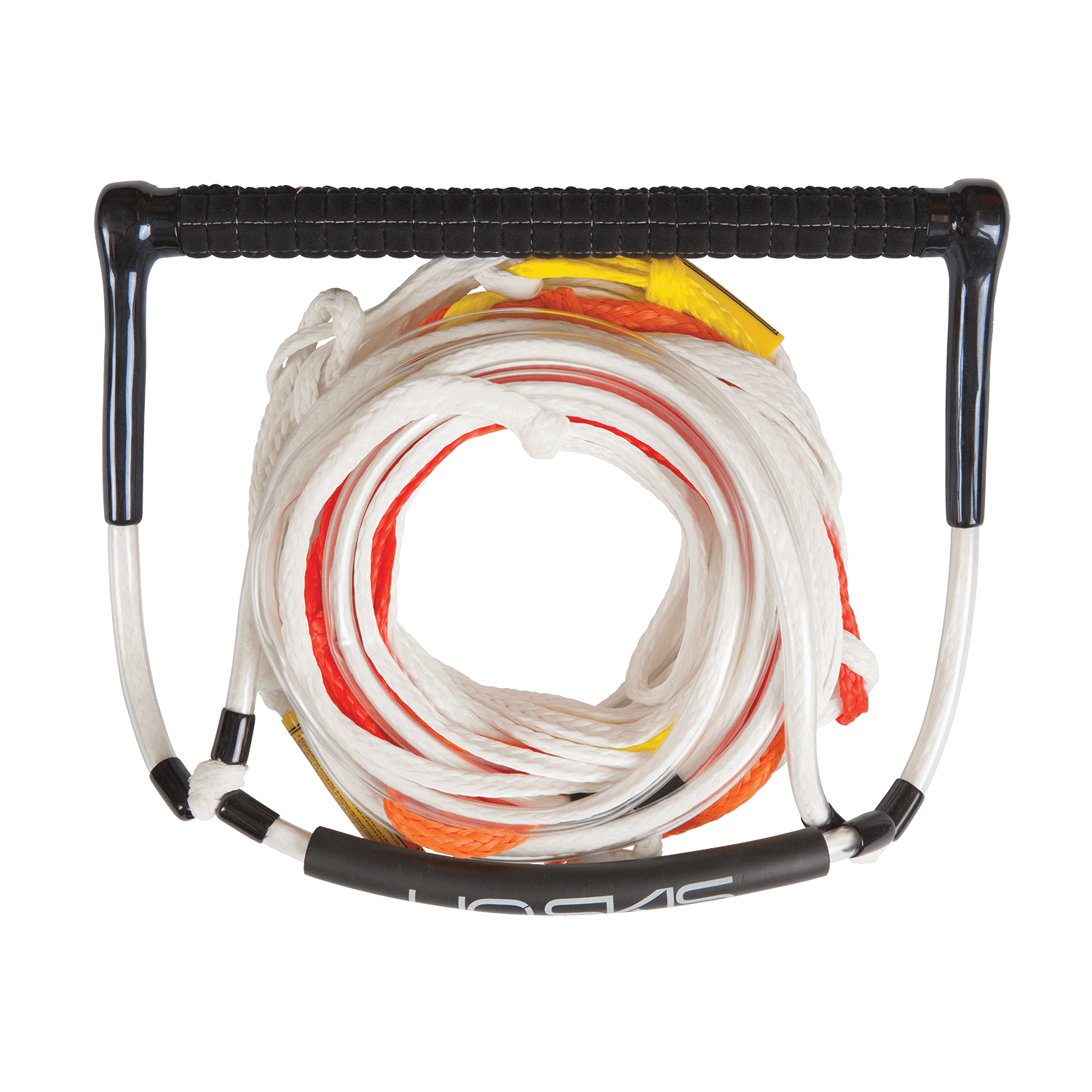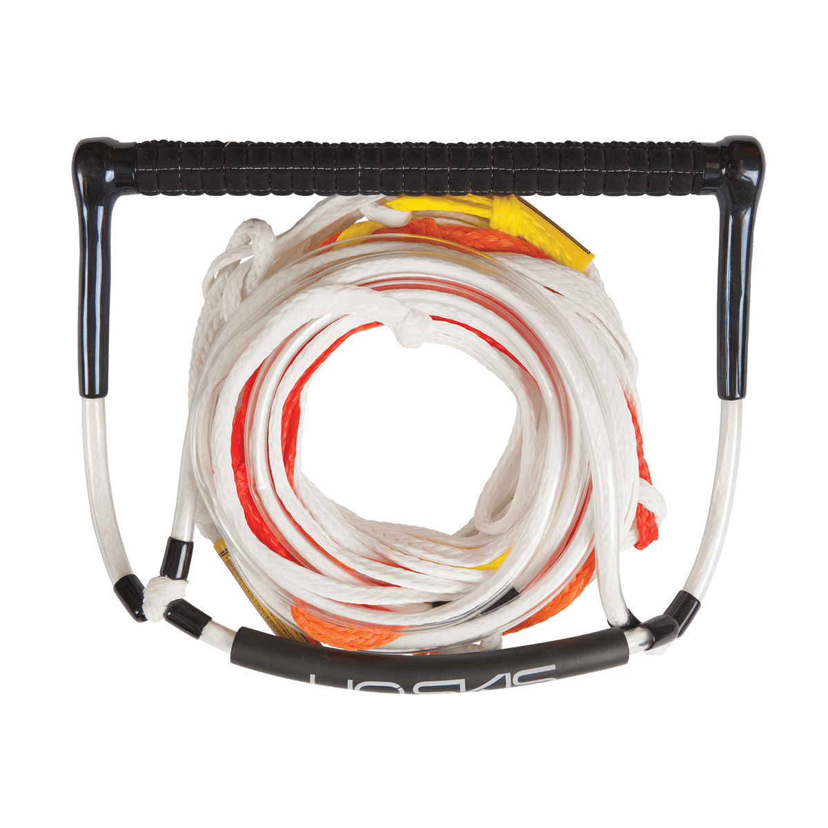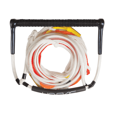 Designed for those looking to master the one ski deep water start, the Universal Deep Rope & Handle features a 12” tacky rubber grip with a rope design that cradles the ski tip for easy one ski get-ups! The skier places their ski tip inside the utra-wide “deep V” area keeping it centered to help with learning proper body position for easy get-ups. It’s coated rope prevents abrasion caused by ski friction while the foam floats make it easy to locate atop the water.