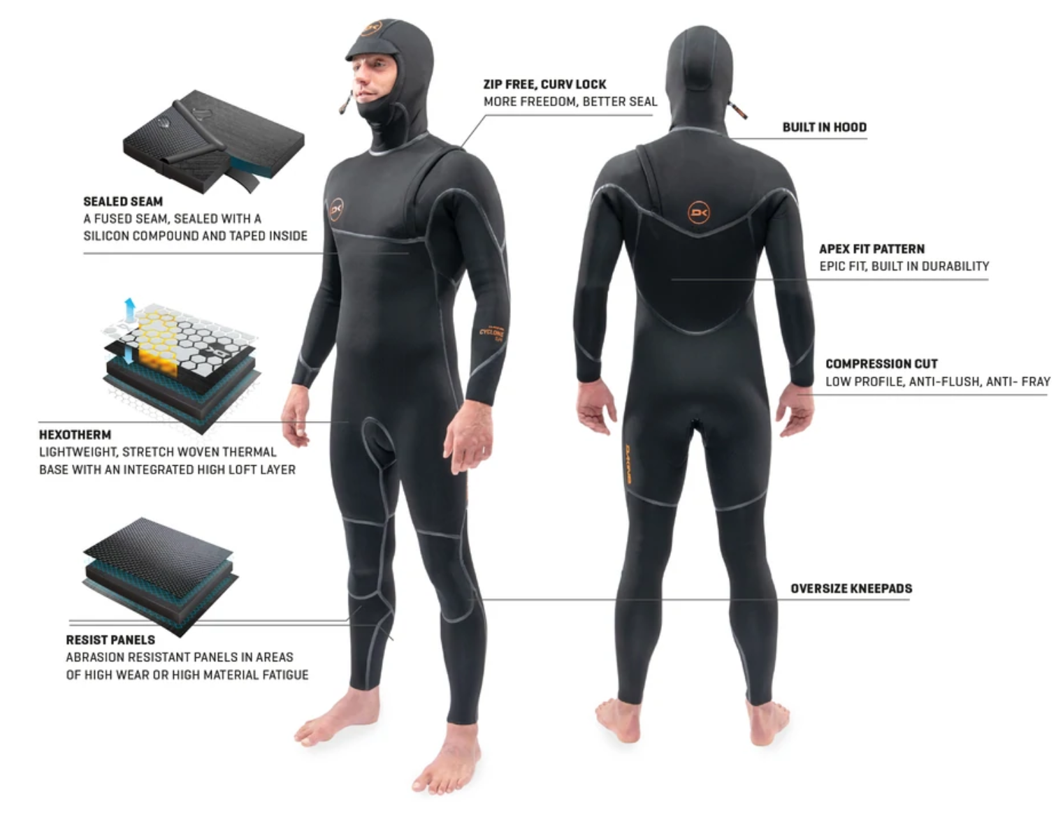 We set out to deliver a high-performance wetsuit with a level of durability yet to be paired with this level of fit, feel, and warmth—until now. First, we created an all-new pattern, engineered for extreme freedom of movement with no stress points. This what we call our Apex Fit. Then we developed and added our own thermal lining called Hexo Therm. Combined with fully taped Triple Lock seams, this suit surfs warmer than its thicker peers, meaning you can go thinner and feel freer. With DK_ Lite limestone based neoprene, triple lock seams, anti-fray cuffs and industry-first Curv Lock, the Cyclone is built with low impact processes like Dope Dyed yarn and solvent free lamination. This Cyclone is the pinnacle of modern wetsuit development.
