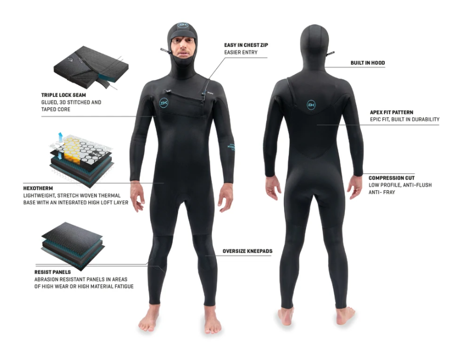 Built from the ground up, our Apex Fit pattern allows extreme freedom of movement and perfect fit without stress points. For high-stretch areas we developed FLX lining, stretch woven with reinforced elastane for next-level strength, matched with internal thermo lining with high loop insulation. Specially designed Hexo_Therm high loft is combined with quick-dry lining placed in core areas to ensure absolute warmth and comfort. Seams are triple locked—twice glued, 3D stitched, and critically taped to seal and reinforce seam junctions. Ankle and cuff seals are reinforced using Resist lining. Oversized knee panels, anti-fray compression cut cuffs, soft feel collar, YKK zips round out this rugged hooded wetsuit.