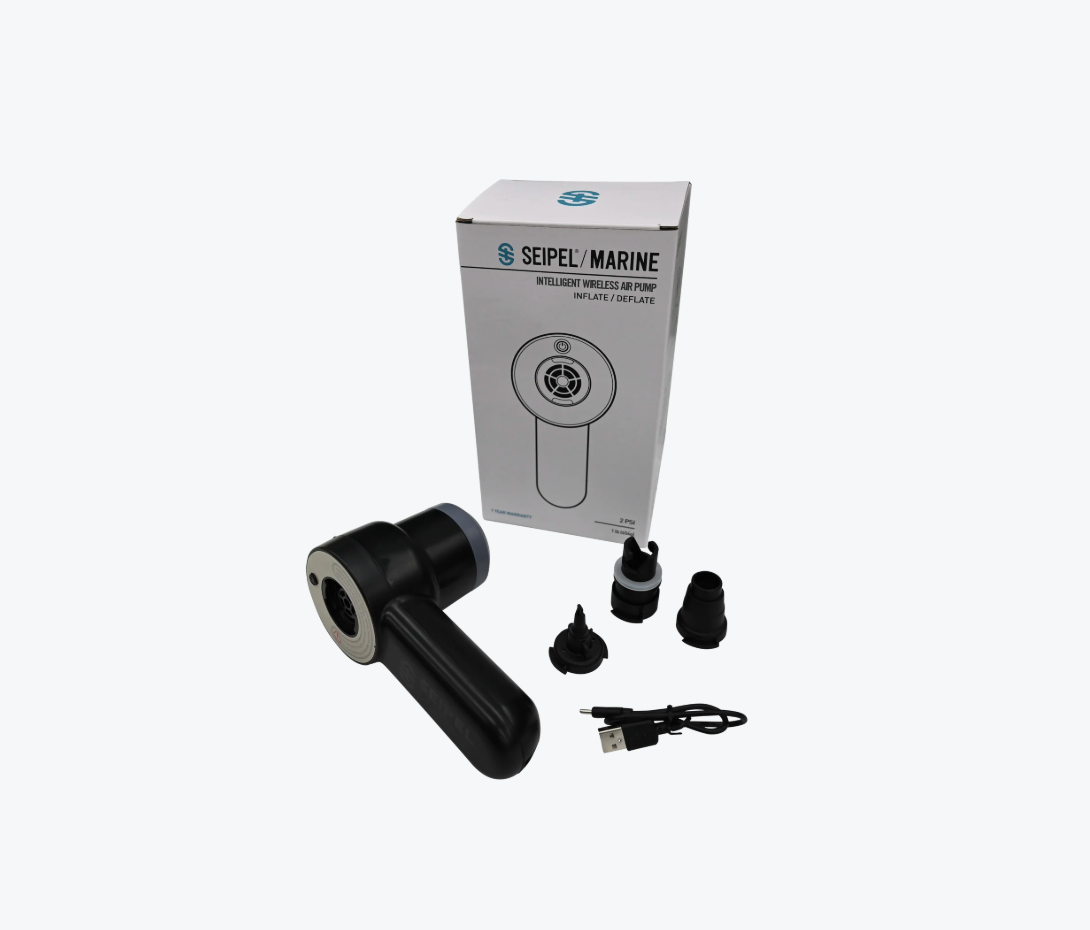 The new Seipel Marine handheld air pump makes filling/emptying all inflatables extremely user-friendly and convenient. It is rechargeable with a USB cable included with the pump. Works on inflatables, Boston valves, Halkey Roberts fittings, tubes, and more.