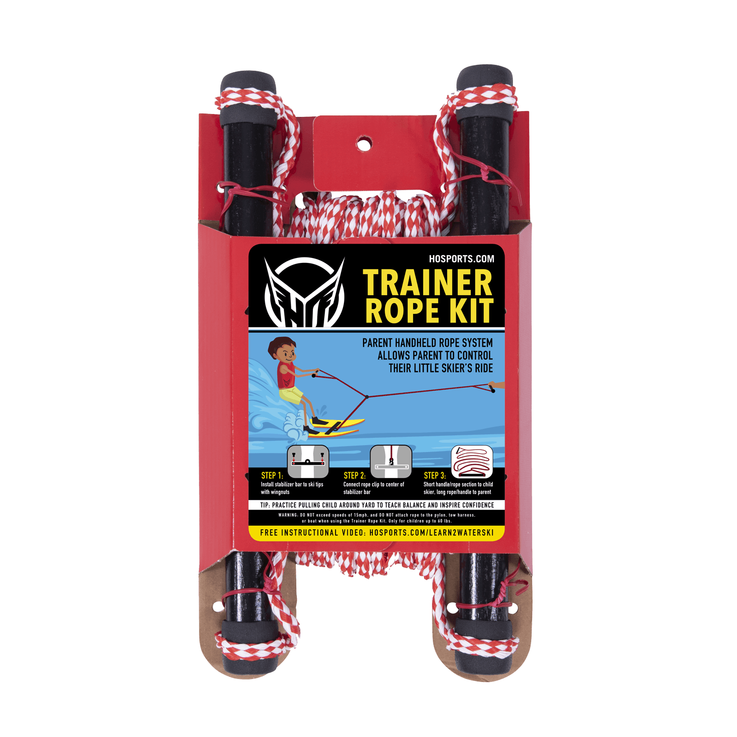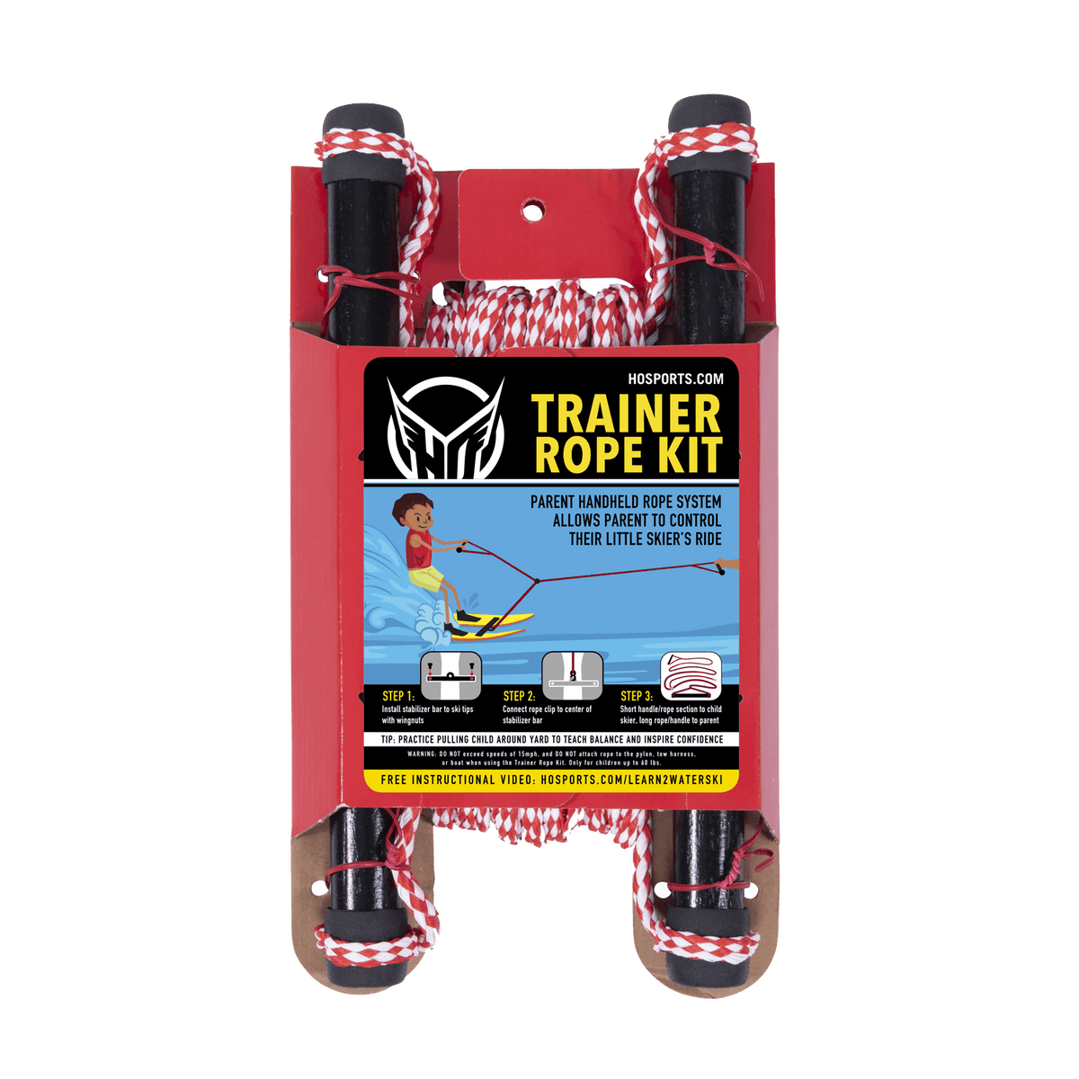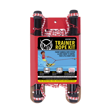 The Hot Shot Trainers include a parent hand held rope system allowing the parent in the boat to control their little skier’s ride. To work in congress with the Hot Shot Trainer Waterskis, this rope features a dual handle system where one side is controlled by the parent while the other side loops through the trainer bar on the child’s ski tips and up for the child to grip. When the skier falls, the parent simply let’s go of their end of the rope for easy mellow falls. Parents can also use this system to pull children around the yard or in the shallows for balance training and confidence building.