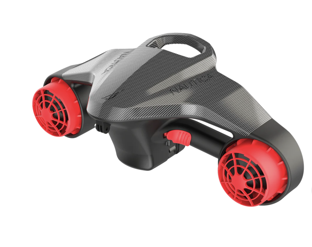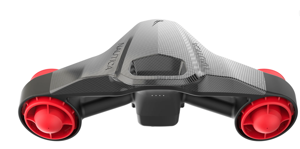 Experience the thrill of underwater cruising with the NAUTICA MARINE 500 Carbon Seascooter This dual-thruster marvel propels you at speeds of up to 3.5 mph (5.6 km/h). Effortlessly switch between three rotational speeds to optimize your energy, allowing for extended dive or snorkel sessions.