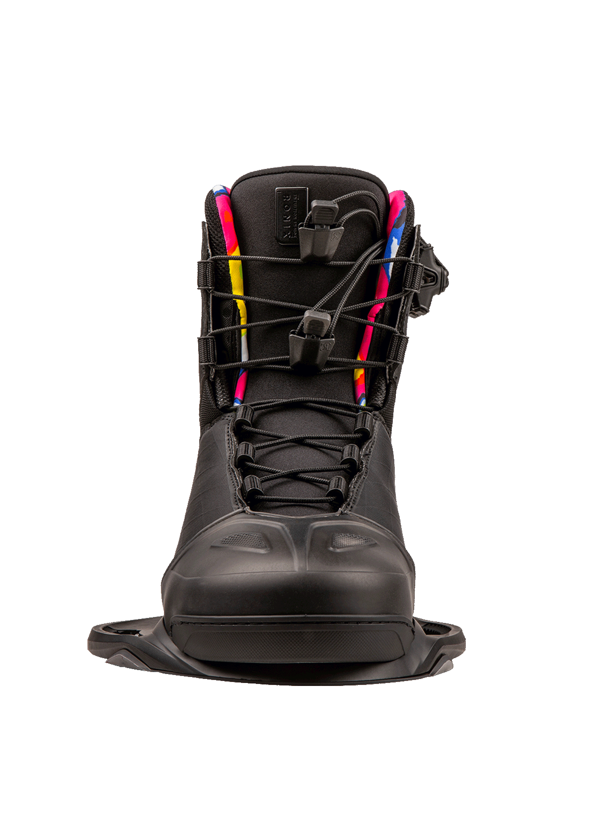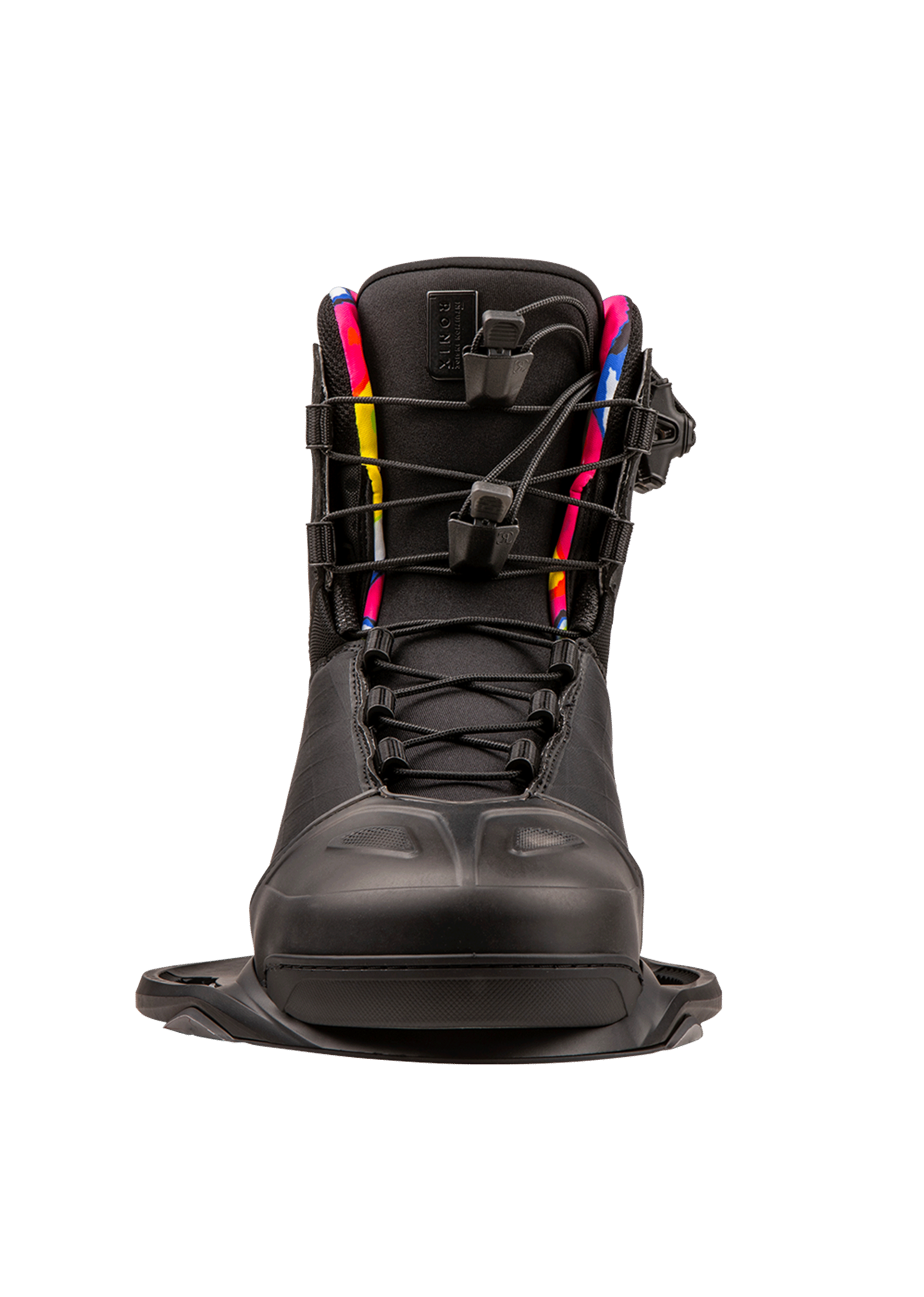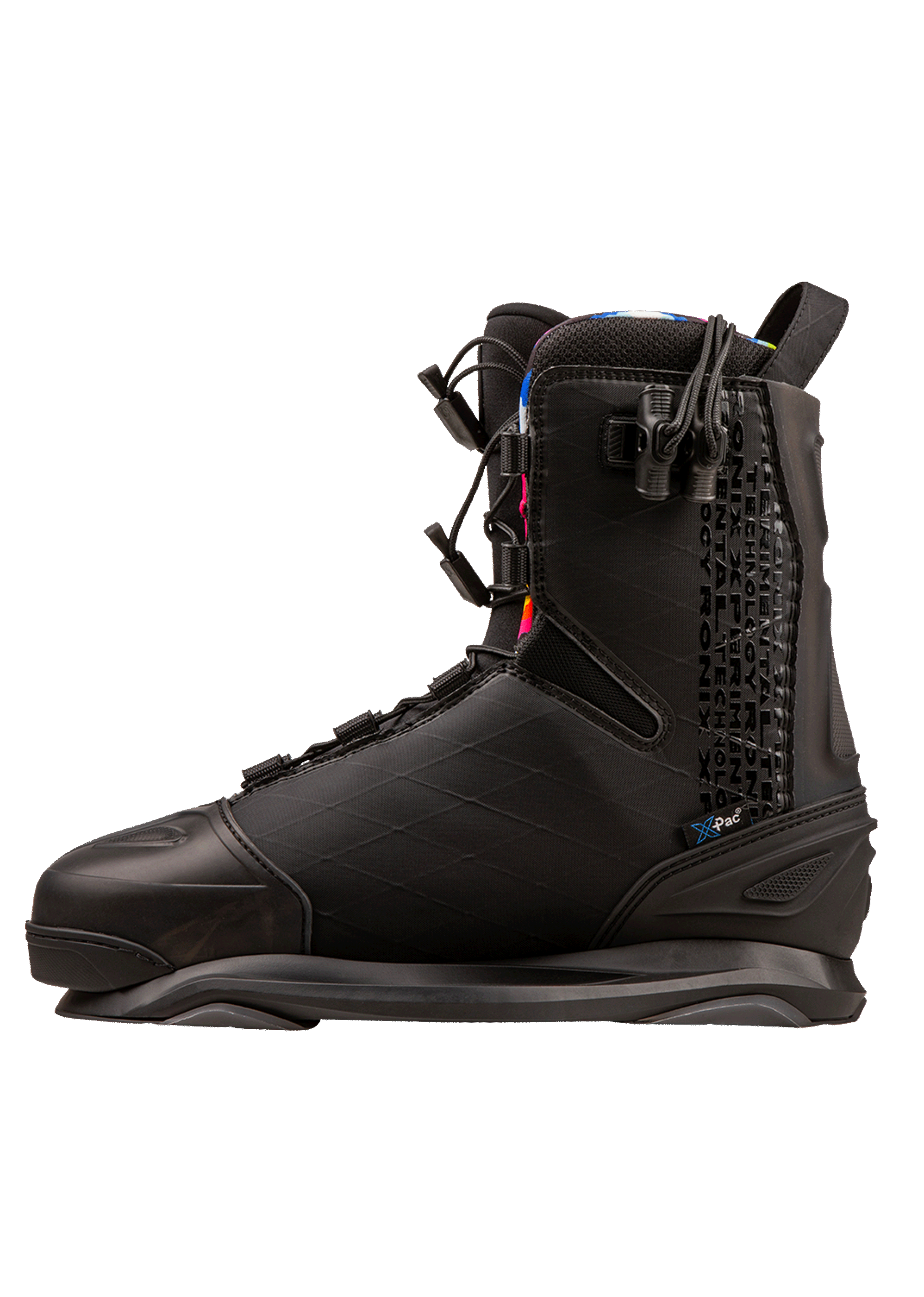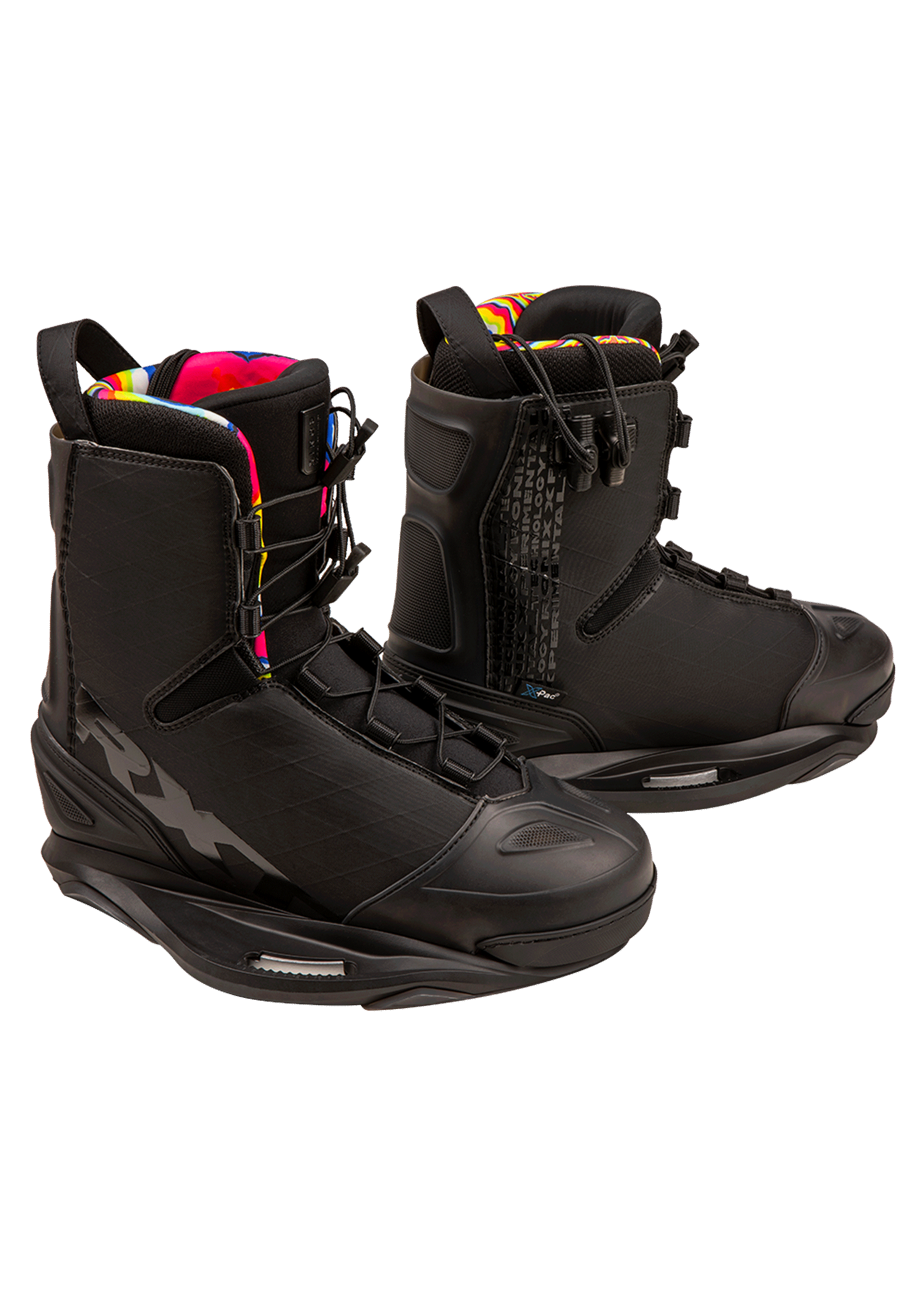 A brand-new, super clean RXT boot built with X-Pac sailcloth, giving the boot lightweight flexibility, without sacrificing durability. Highlighted by our proprietary Intuition+ heat moldable liner and enclosed around the heel and toe by FlexForm, this unique material compound creates ultimate flex, comfort, and longevity. Ronix Xperimental Technology has the perfect blend of a stealth midnight exterior and a vibrant kaleidoscope inside. Lightweight support for the rider that wants the most in side to side mobility without sacrificing heel hold down.