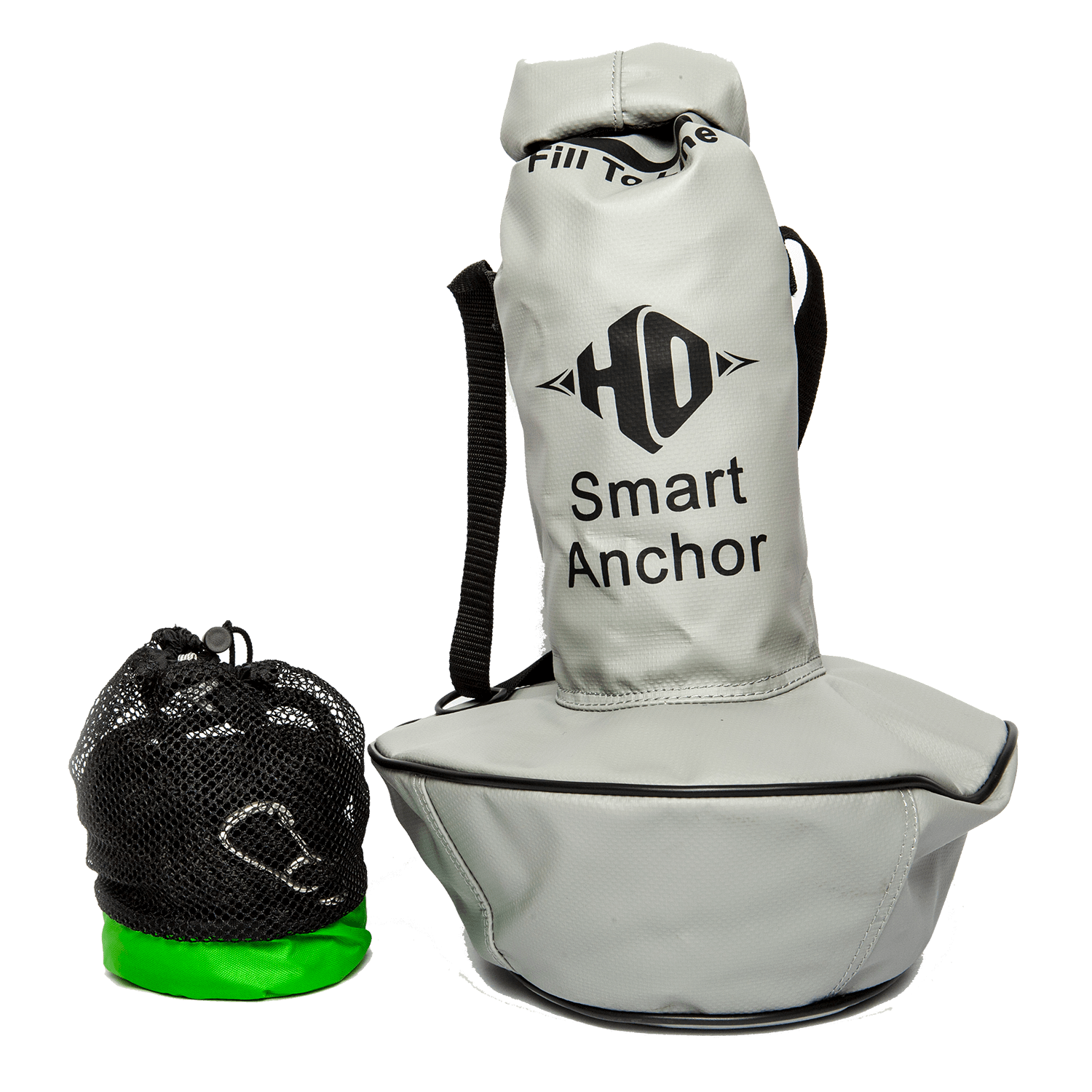The HO Smart Anchor is a mushroom shape bag anchor. Fill it with rocks or sand and anchor large towables, iLANDs or iSUPs in up to 30 feet of water. Use the smart anchor to give your towables another life as floating islands. The Smart anchor includes a reinforced anchor bag, variable length 30 foot anchor line, and attached floating rope collection bag to keep the excess rope safely out of the way.
