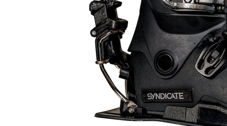 The Syndicate Hardshell Boot & Binding System has proven to be one of the most popular binding systems on the market. This year we’ve made some key improvements to this industry favorite model. A brand new Pro Plate, which is now aluminum, has longer screw slots for more adjustment forward and backward. The Liner has also been updated, being thinner throughout, for better performance, feedback and connection to the ski. This Hardshell system creates maximum reliability, performance, and adjustability. The release mechanism employs an adjustable spring loaded heel unit that allows for tension release point modification in relation to skier weight and preference. Unique to the industry is our Full Contact Outsole. This contoured heel and toe zone enables full contact between boot and plate thereby stabilizing the connection by reducing lateral slippage and increasing agility. The light weight yet reliable snow ski inspired boot buckles allow for personalized tightening. Use the buckle ladder to tighten or spin the buckle for a more customized fit. The Memory Buckle allows you to get a consistent tightness on the upper cuff every time you ski. We’ve added surface area and 50% more thickness to the Protective Coated Stainless Steel Toe Hoop, adding even more reliability to the system. We’ve updated the Heel Release Mechanism with a Stainless Steel finish, making it longer lasting even in salt or brackish water. In addition, the new Stainless Steel Release Arms are more vertically angled to better keep the heel solidly connected to the plate. This also provides more room for the backfoot, for those who prefer a narrower stance or those with a taller back boot.