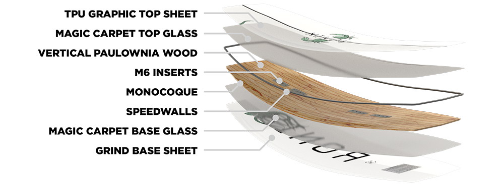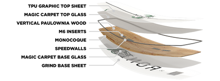 Made with vertical Paulownia stringers running tip to tail, the core tapers from the middle of the board to the ends, creating a variable flex that increases the yield in a press.