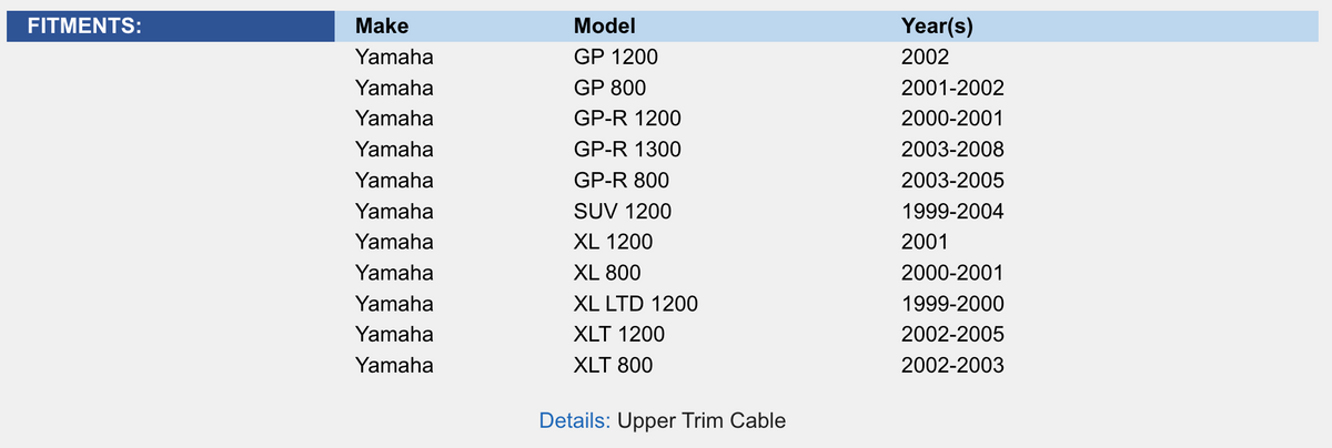 Trim Cable: Yamaha 800 / 1200 / 1300 99-08