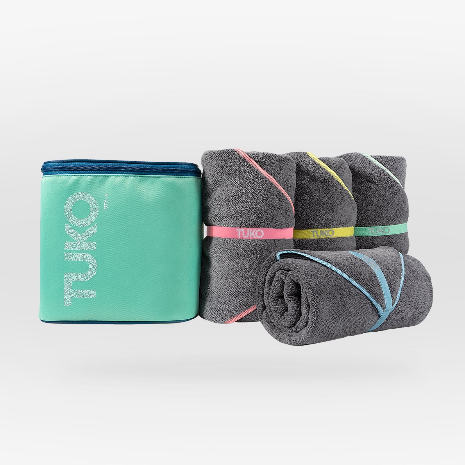 TUKOs come in a convenient four-pack that includes a water-resistant carrying case. Don't settle for a bulky, slow-drying cotton towel - upgrade to TUKO!