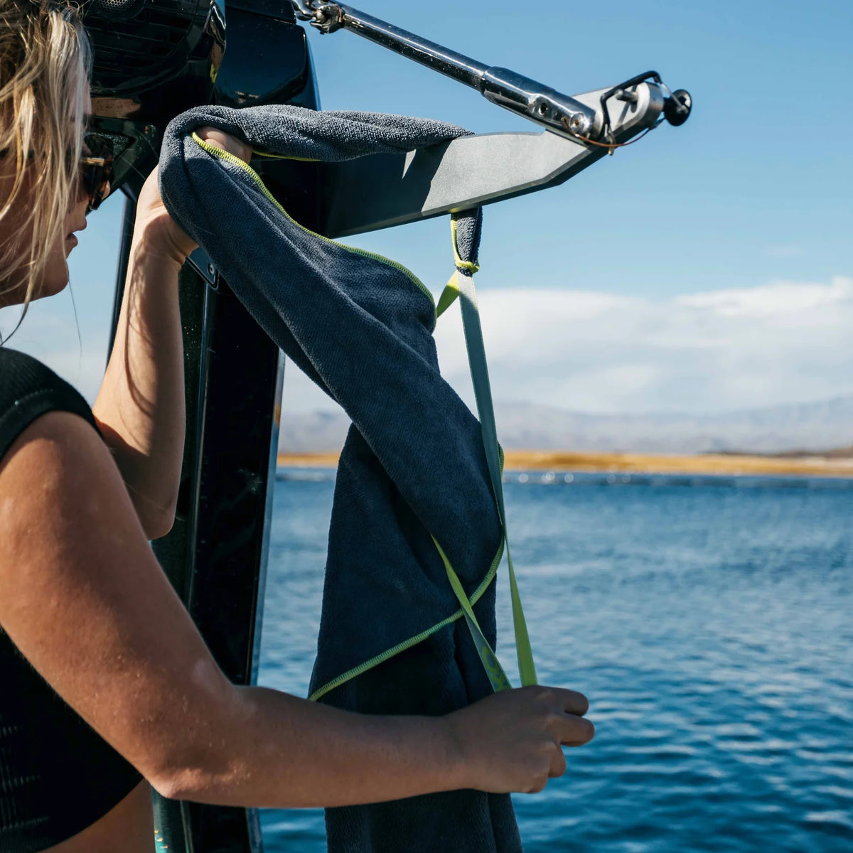But what really sets TUKO apart is its integrated strap. Use it to attach the towel securely to your boat tower or bimini for fast drying, or to roll it up tight for easy storage. And with four different trim colors, you'll always know which towel is yours.