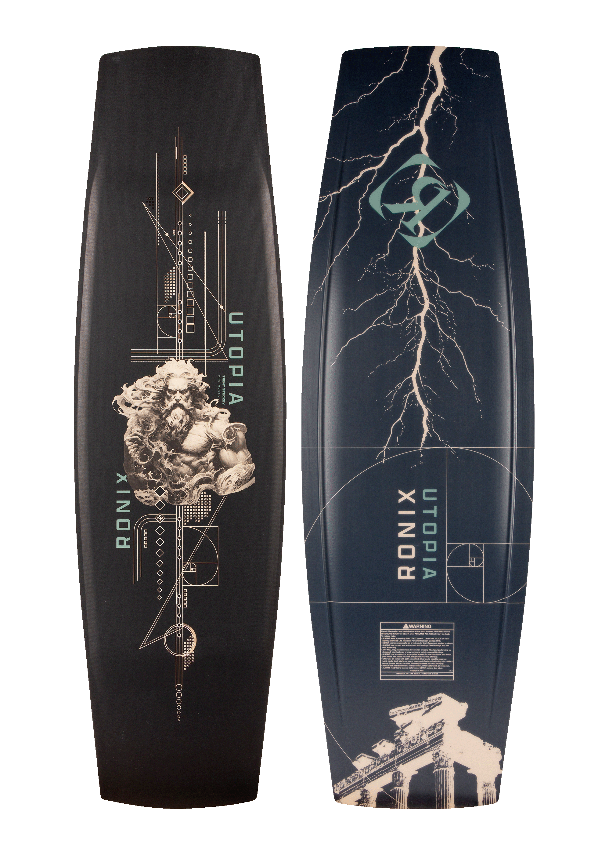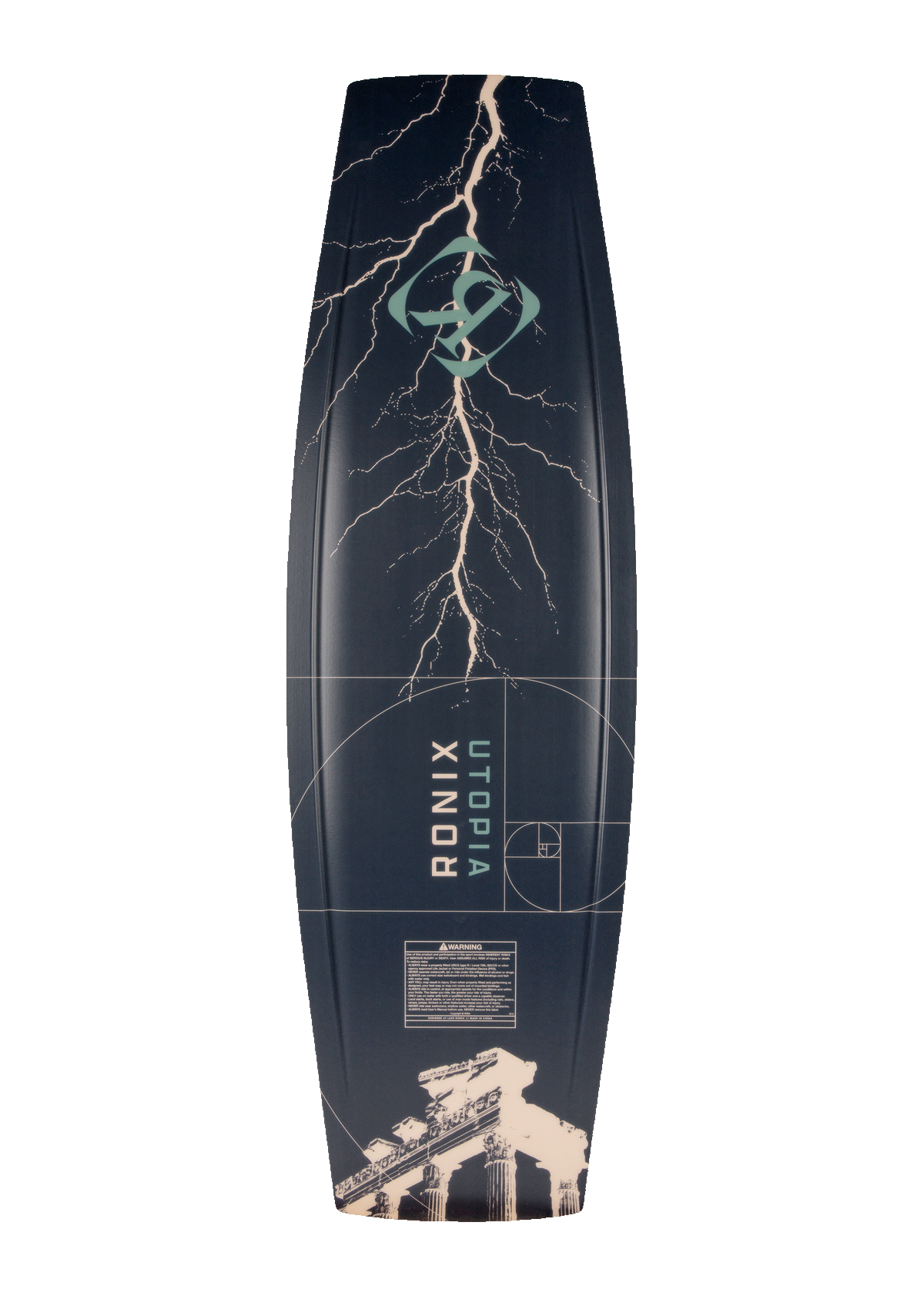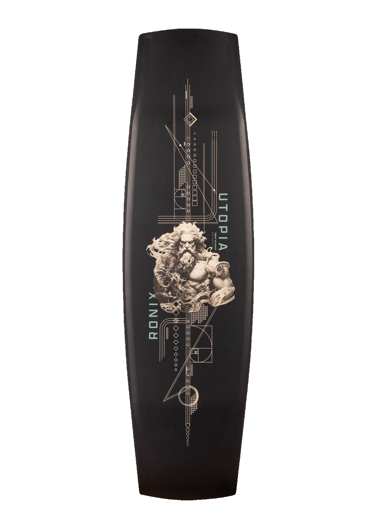 Trent Stuckey has been behind the scenes working on his first signature park board for years. Trent was looking for a conventional construction but wanted to have the board taper through the tip and tail to the thinnest profile of any Ronix board. The result is a board that loads into a tip or tail press easier than anything we have ever ridden which works well for both beginners and seasoned pros. A relaxed rocker line in a class all by itself which allows for speed on the water and stability on features, and the curve between the boots provides softer landings. The channels are pulled in which means you will not feel them while riding a feature. The Utopia also has a tip/tail concave to lock onto those pipe features as well as enhance on water performance. Trent also wanted finite stance options, so the inserts are spaced 25% closer together and we added 4 additional inserts for a greater spread of stance widths.